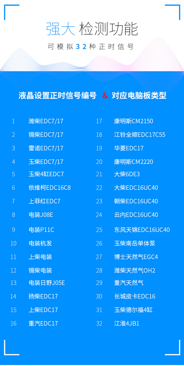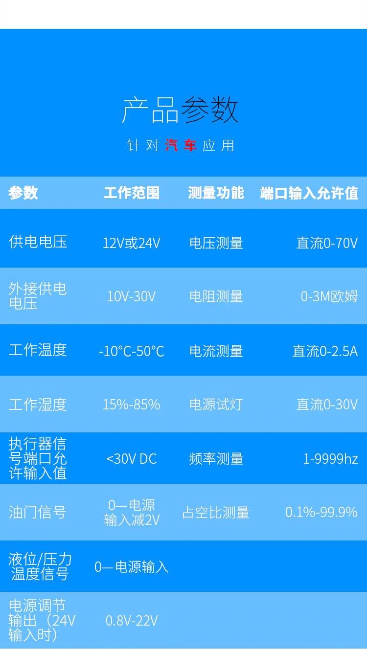 轉速信號、車速信號(霍爾、磁電、光電信號)、ABS輪速信號、氧傳感器信號、節氣門信號、空氣流量計、進氣壓力傳感器(模擬、數字)、爆震傳感器等信號模擬。